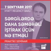 Azərbaycanda bir sıra beynəlxalq səviyyəli sərgi və konfransların təşkilatçısı “Caspian Event Organisers” (“CEO”) şirkəti payız sərgi mövsümü ərəfəsində “Sərgilərdə daha səmərəli iştirak üçün nə etməli” mövzusunda seminar keçirmək üçün “Sərgilərdən maksimum faydalanmanın yolları” adlı praktiki tədris vəsaitinin müəllifi, “EkspoEffekt” (“ЭкспоЭффект”) sərgilər üzrə məsləhət agentliyinin Baş direktoru Nikolay Karasevi (Rusiya) Bakıya dəvət edib.